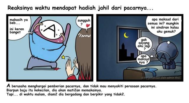 Dan kalo misalnya sang pacar ngasi hadiah baju, tapi baju itu ternyata kekecilan, A bakalan tetep nerima dan mengatakan “Ini kerena banget dan pasti bakal perfect buat aku.” dengan pikiran ‘Kalo misalnya aku bilang kekecilan. Kasian dong dia yang udah keliling dari butik ke butik buat nyariin ini. Jadi yaudahlah. Aku diet beberapa hari, bajunya bakal cukup kok.’